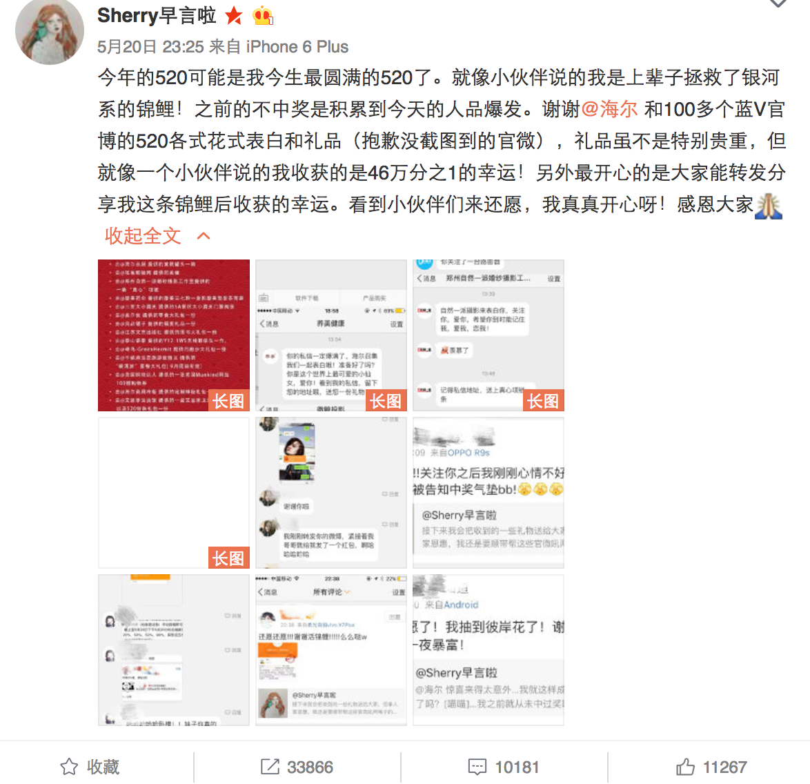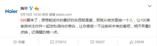 520表白日,海爾搞了一個事情,聯(lián)合60多家藍V,給一位幸運粉絲送禮物。這條轉(zhuǎn)發(fā)評論送禮物的微博在半個小時之內(nèi)就轉(zhuǎn)發(fā)過萬。