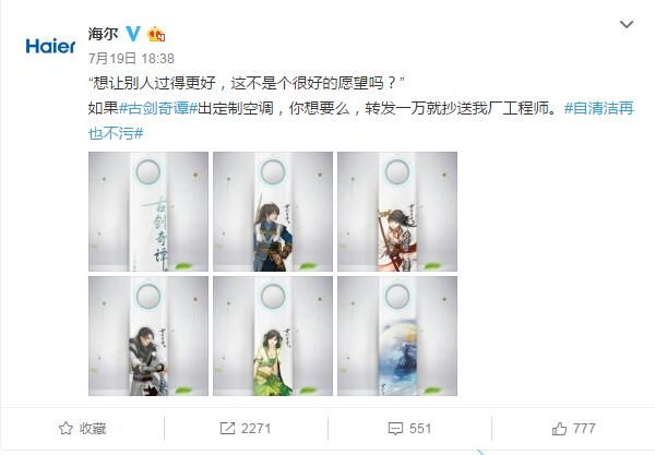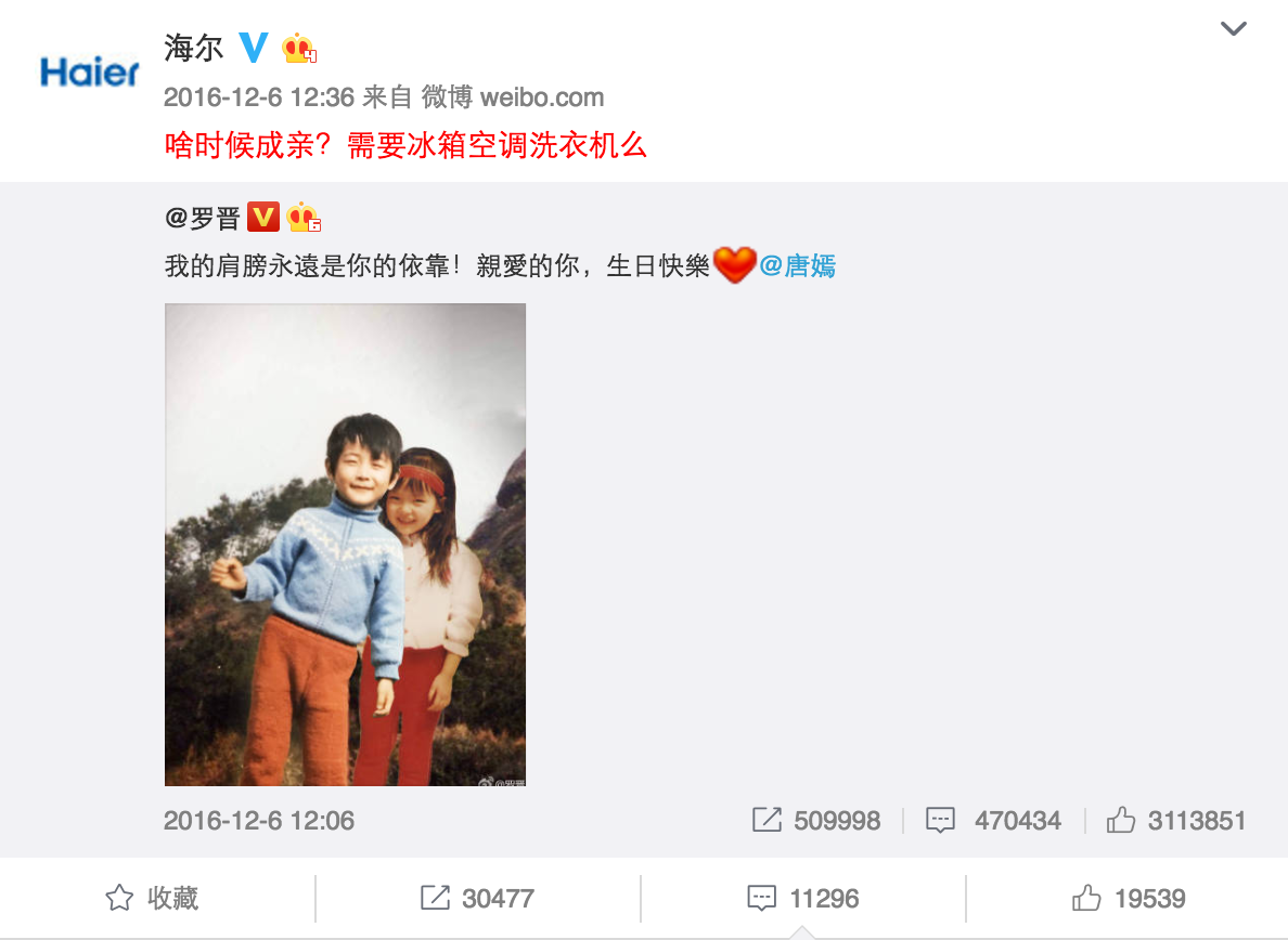 說到海爾,大家的第一印象大多都是搶熱門。比如唐嫣羅晉公布戀情時,海爾官微借勢發(fā)布微博"啥時候成親?需要冰箱空調(diào)洗衣機么"成功帶領(lǐng)了一眾藍V搞事情,因為這個句式很容易被模仿,所以藍V的參與度非常高。