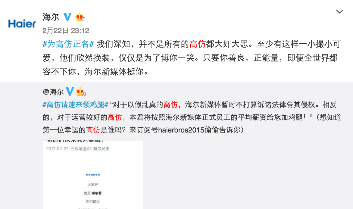 不知道從什么時候開始,平時刷微博時你會發(fā)現(xiàn)很多的高仿號,潛伏于各大評論中真假難辨。@海爾作為藍V總教頭,也遇見過很多海爾的高仿號,后來發(fā)現(xiàn),其實這些高仿號是海爾的年輕用戶,他們想搶熱門,跟你的粉絲有效互動。面對這么一批可愛的小粉絲,@海爾沒有封殺,而是做官方聲明,只要你善良,且正能量,哪怕全世界都不管你我們呼喚你,甚至還給高仿號發(fā)福利。