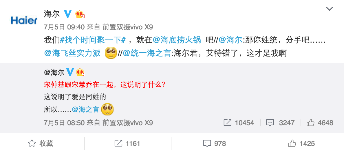 海爾搶熱門的能力在前幾天宋仲基宋慧喬公布戀情時,再次得到了印證。海爾迅速get到了宋仲基和宋慧喬同姓的點,發(fā)微博@和自己同姓的品牌強行組CP,同姓組CP這個點也很容易被模仿,藍V參與度也異常高漲,比如"海信@海天醬油"、白貓凈界@白敬亭"等等。