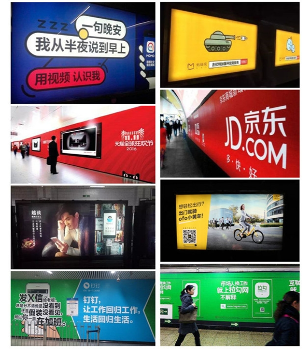 簡單配色、重復表達。網易云音樂、知乎、陌陌、美團、京東都用,產品代表色來進行地鐵刷屏,長時間內大量重復,可以讓人將品牌與顏色畫上等號,進而達到占領消費者心智的目的。